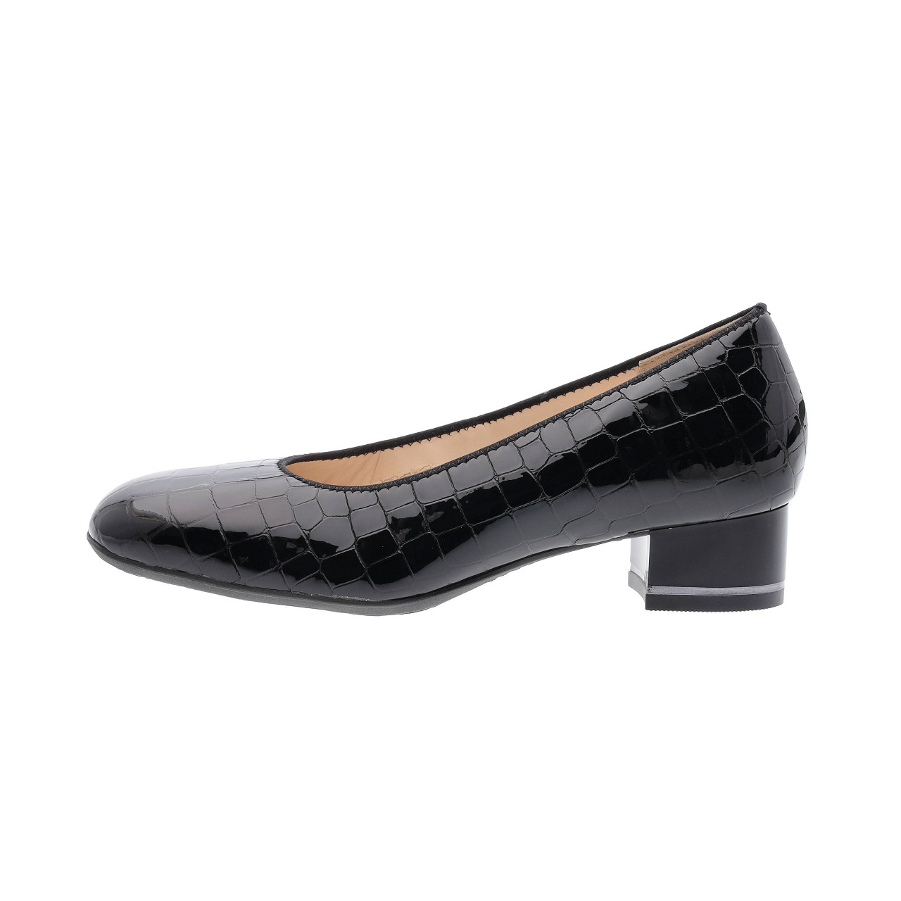 Svart pumps från Ara i lack och skinnfoder. Tunn gummisula och låg klack.