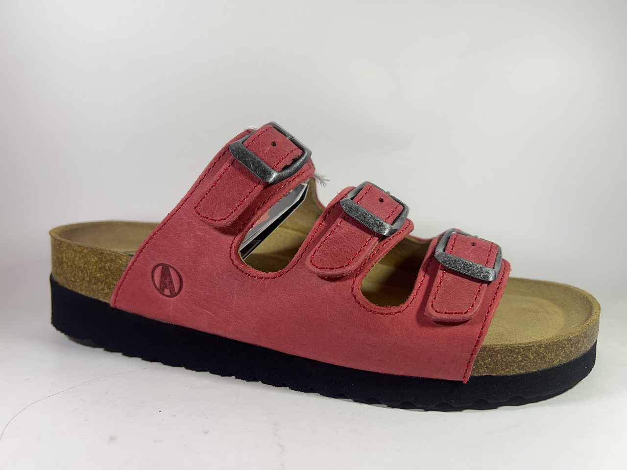 Sandal från Axelda i röd nubuck. Justerbar i alla tre remmar. Skinnklädd invändigt och mockabotten.