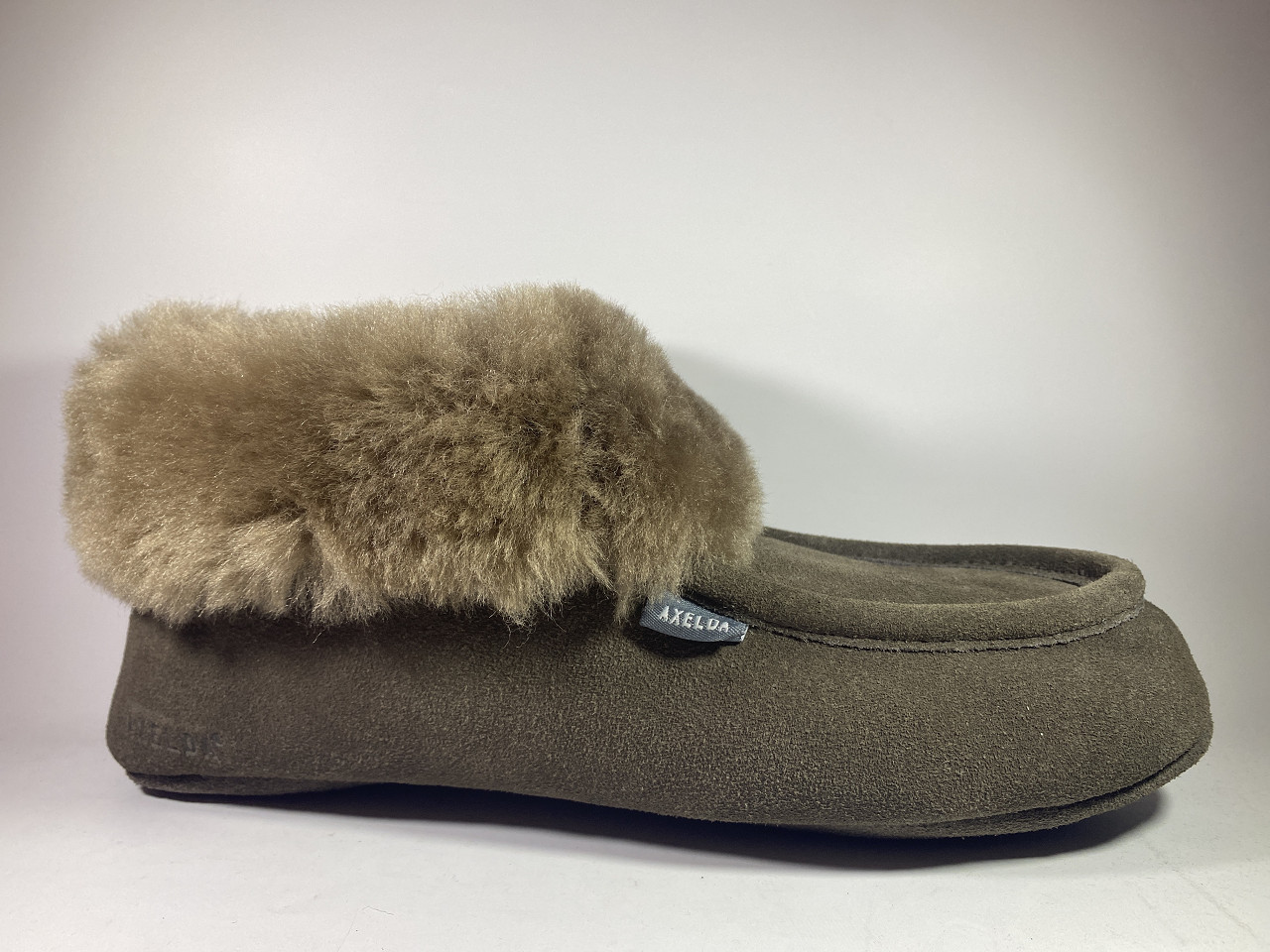 Fårskinnstoffel från Axelda i brun mocka medx härligt frdskinn invändigt. Sulan är i greppvänlig mocka med gummeringsinslag på häl och framfot.