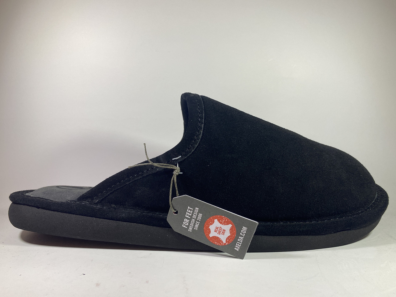 Svart slip-in toffel i mocka, både ut och invändigt från Axelda med hård skumgummibotten för bästa komfort och grepp.