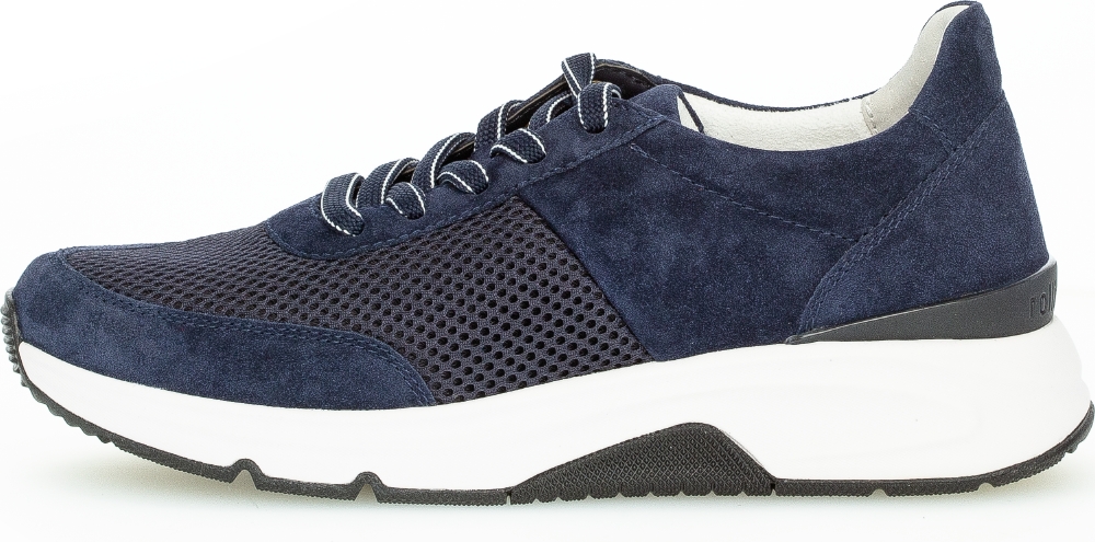 Promenadsko från Gabors sportigare serie Rollingsoft i blå mesh med vit sula. Snörning och uttagbara sulor med plats för egna inlägg.