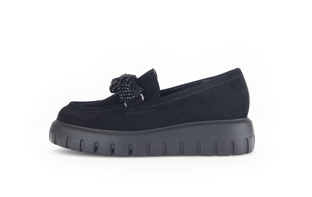 Loafer i vart mocka från Gabor. Omtag över vristen i form av en kedja av små "pärlor". Kraftig sula med flexzoner där skon böjer sig.