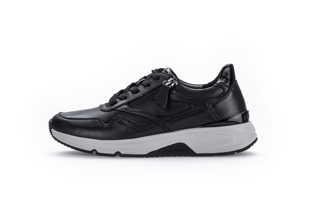 Svart skinnsko i Gabors serie Rolling soft. Här med grå sula, svart kedja och snörning. Lackdetalj på hälkappan. H-vidd.