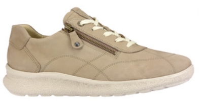 Promenadsko från Hartjes i beige nubuk med ljus sula. Den har snörning och dragkedja på utsidan. Bred läst K-läst och uttagbara sulor med plats för egna inlägg.