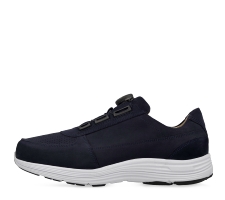 Promenadsko från Klaveness (Hästen) i mörkblå nubuk med vit sula. Den har en bred läst och uttagbara sulor med plats för egna inlägg. Snöres på med den smidiga boasnörningen.