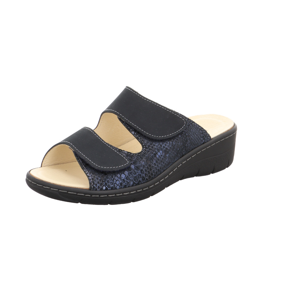 Blå slip-in i skinn från Longo med rvå reglerbara remmar med kardborreband. Löstagbara innesulor med plats för egna inlägg.
