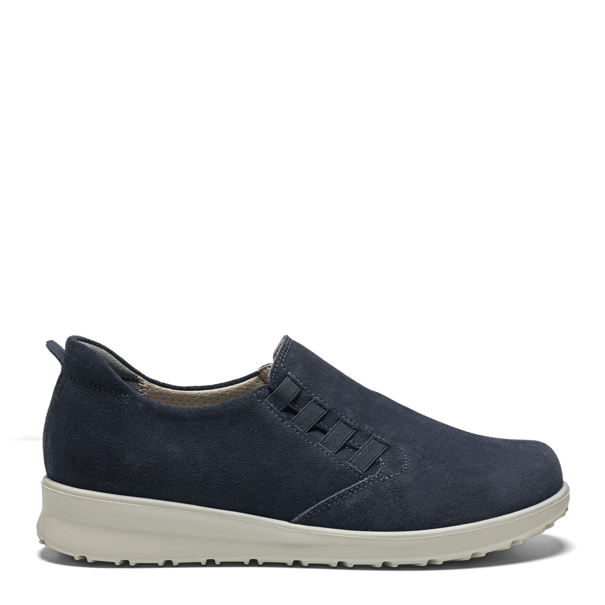 Promenadsko i loafersmodell i blå mocka med ljus sula från New Feet. Den har en bred läst och uttagbara sulor med plats för egna inlägg. På båda sidor om vristen är det resårer vilket gör den lätt att ta på och av.