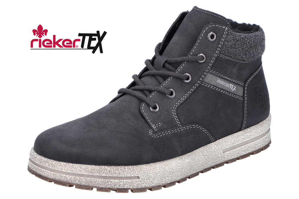 Svart varmfodrad känga från Rieker med både snörning och dragkedja. Ljus kraftig slitsula.