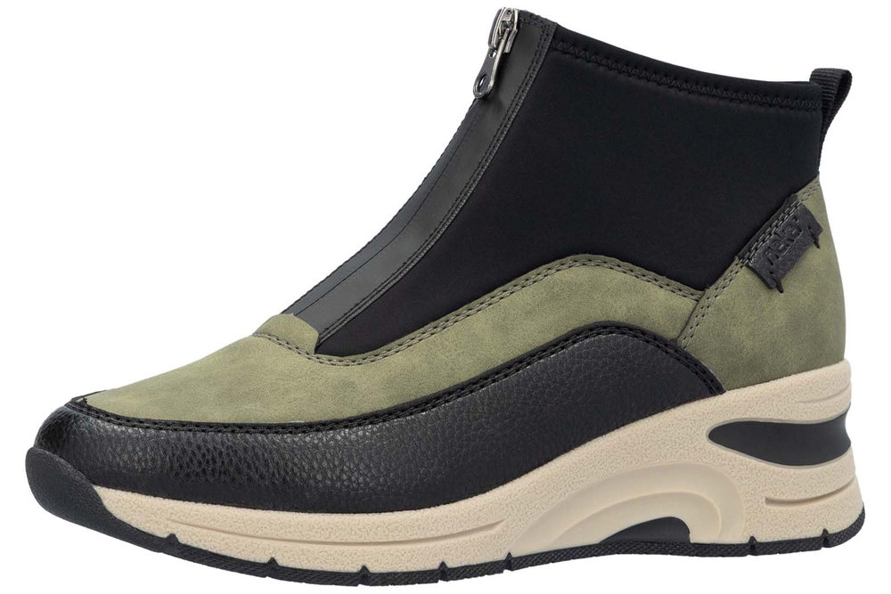 Kort känga på liten kilklack i svart/grönt från Rieker. Översta delen i strechtextil och en dragkedja fram.