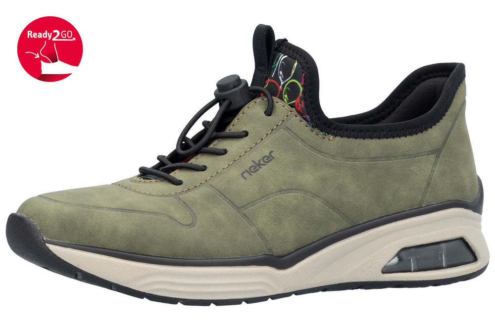 Promenadsko i grönt med svarta detaljer och ljus sula från Rieker. Smidig att ta på, bara tryck i foten, behövs inget skohorn. Snörning med snörlås.