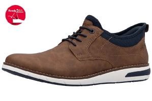 Promenadsko från Rieker i brunt med blå detaljer och ljus sula . Snörning som dekor, används som en loafer, med Riekers system Ready to go. Behövs inget skohorn.
