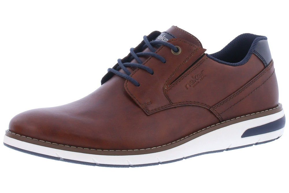 Promenadsko i brunt skinn och vit sula från Rieker. Den har snörning och en liten resår på varje sida om vristen för en bra passform.