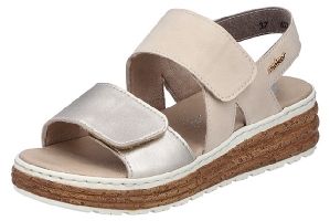 Beige/guld sandal från Rieker med korkfärgad sula. Två reglerbara remmar med kardborreband.