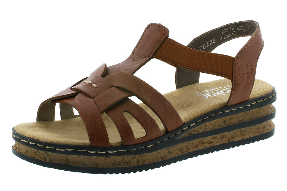 Sandal från Rieker i congac med mönstrad sula, resår i remmen över vristen.