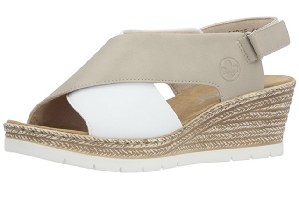 Sandalett med kilklack från Rieker. Den har en beige och vit ovandel. Bakremmen fästes med en kardborre.