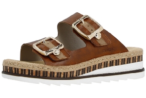 Slip-in i brunt skinn från Rieker. Liten kilklack och grov sula. Justeras med kardborre på båda remmarna. Guldspännen som dekor ovan.