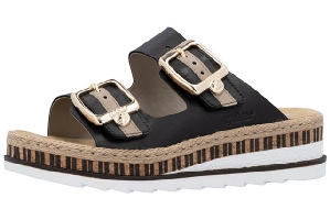 Slip-in i svart skinn från Rieker. Den har lite kilklack och spännena på remmarna i guld som är reglerbara med kardborre.