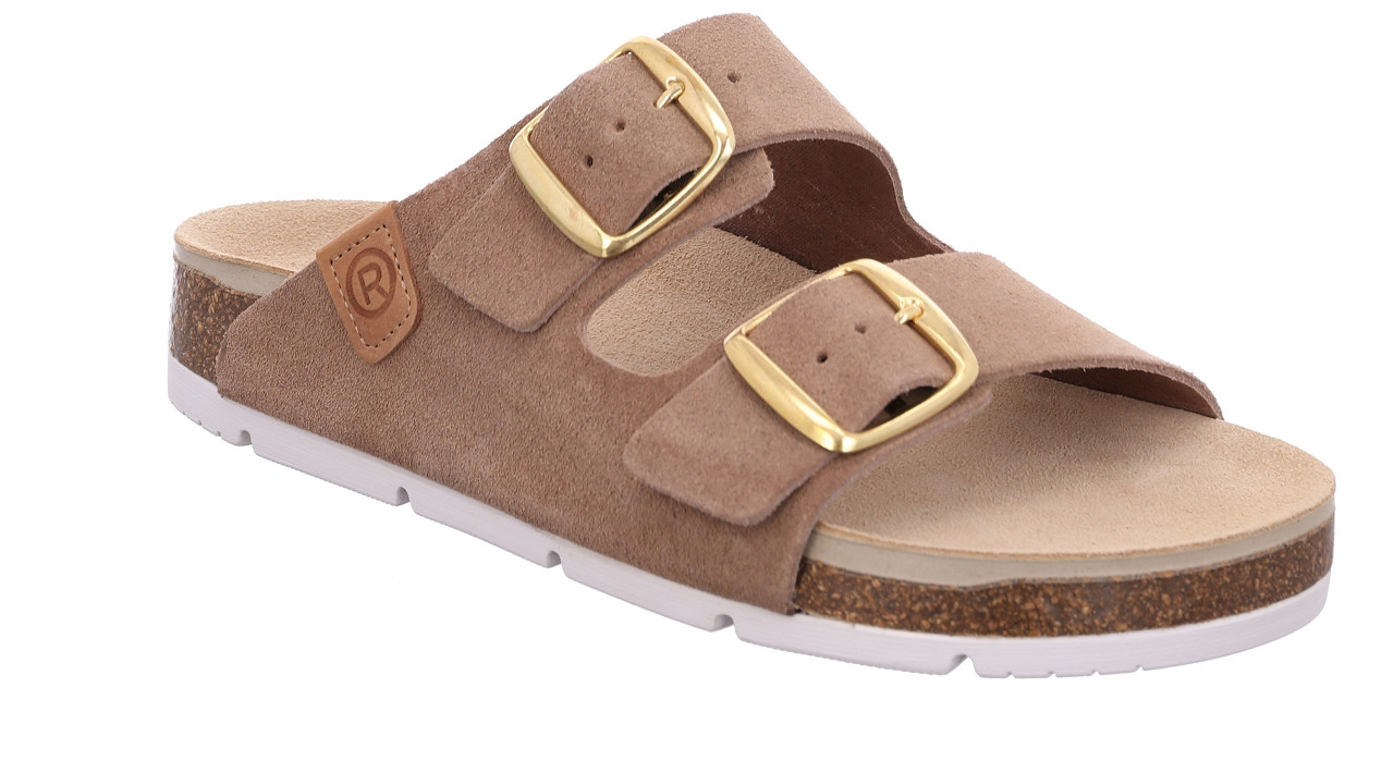 Biosandal från Rhode i brunbeige mocka med justerbara guldspännen. Mjuk och skön sula med mockabotten och gummisula.