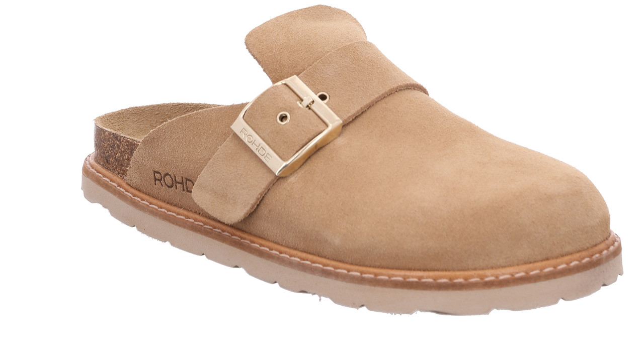 Slip in sandal med hel tå, reglerbart spänne över vristen i mässingfärg. Mjuk o skön innersula. Ovandel i härligt ljus mocka.