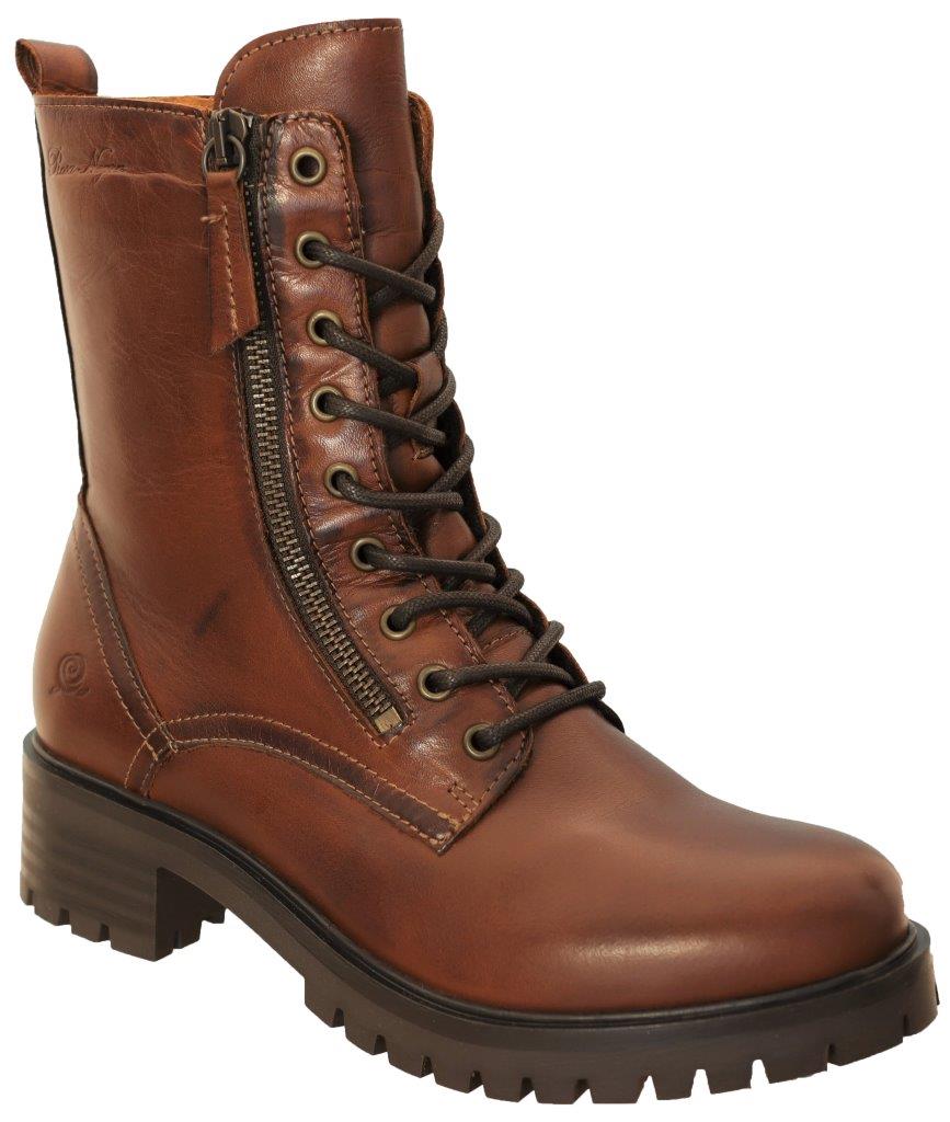 Känga i brunt skinn från Rosa Negra. Den är tunnfodrad med en grov gummisula. Dragkedja på insidan samt snörning. Kedjan på utsidan endast dekor.