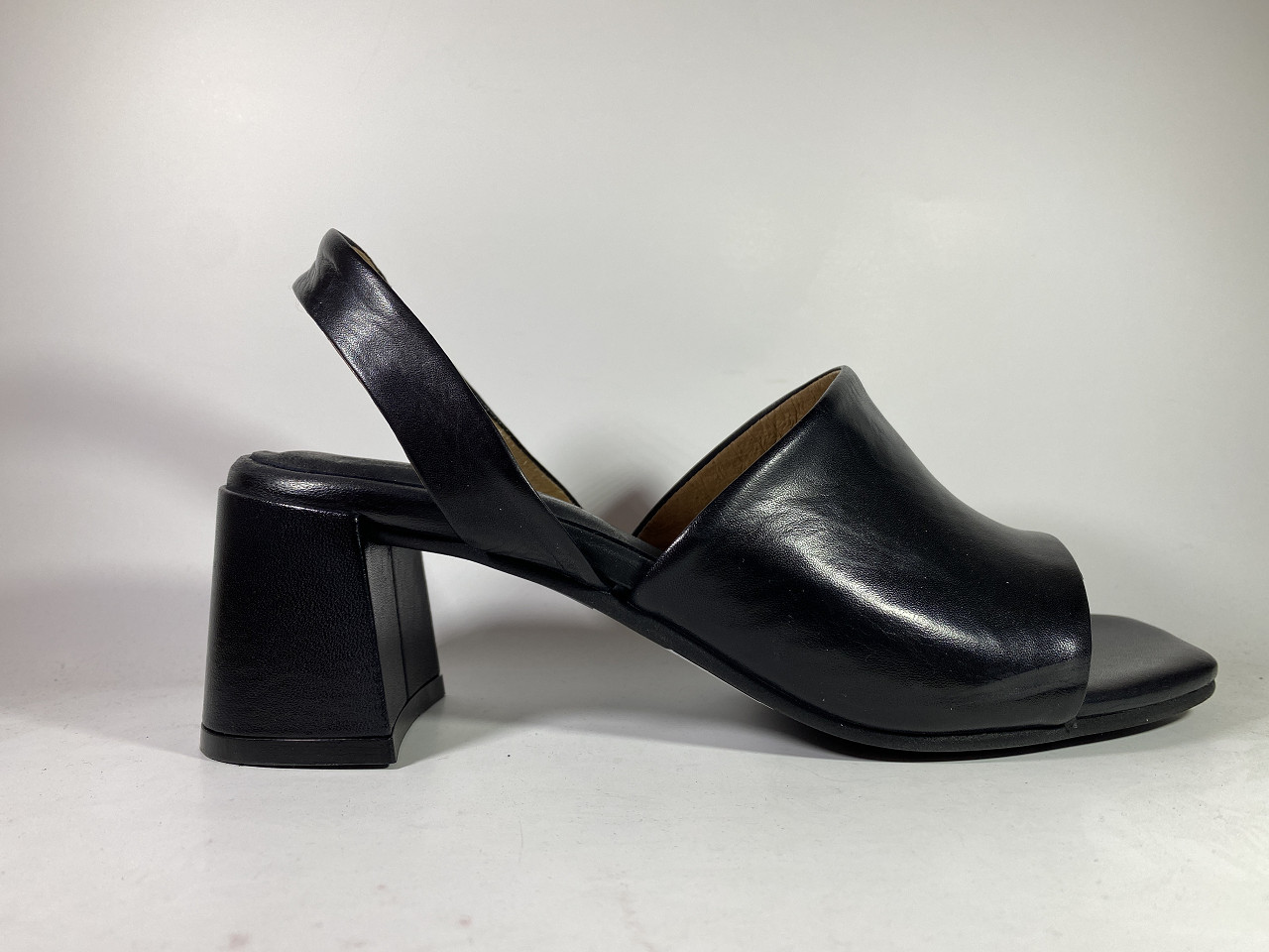 Sandalett från Rosa Negra i svart skinn. Hel ovandel över vrist med öppen tå och hälremmen är med resår. Helt i skinn, även invändigt.