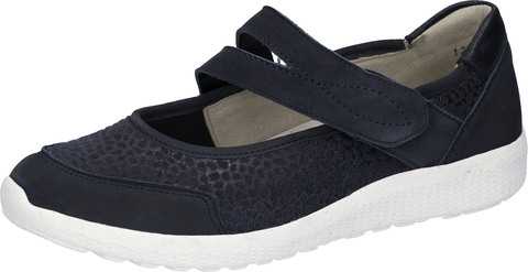 Blå promenadsko med vit sula från Waldlaufer i skinn och mjukt stretchmaterial. Rem med kardborreband över vristen, lösttagbara innesulor med plats för egna inlägg, bred läst.
