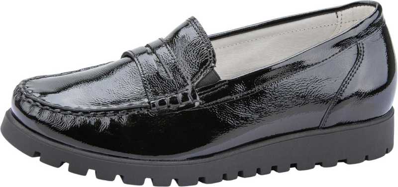 Promenadsko i svart skinnlack, loafersmodell från Waldläufer. Den har uttagbara sulor med plats för egna inlägg samt bred läst, H-läst.
