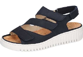 Sandal i mörkblå nubuck med 3 justerbara remmar över tådel och vrist med kardborre. Även hälremman är kardborrejusterbar. Löstagbar innersula, H-vidd.