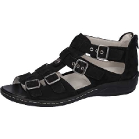 Sandal från Waldläufer i svart mocka. Den har en dragkedja bak samt att alla fyra remmar ovan är ställbara med spännen. Den har en bred läst H-läst och uttagbara sulor med plats för egna inlägg.