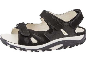 Sandal från Waldläufer i svart skinn/mocka. Den har en bred läst H-vidd och uttagbara sulor med plats för egna inlägg. Alla tre remmarna justerbara med kardborre.